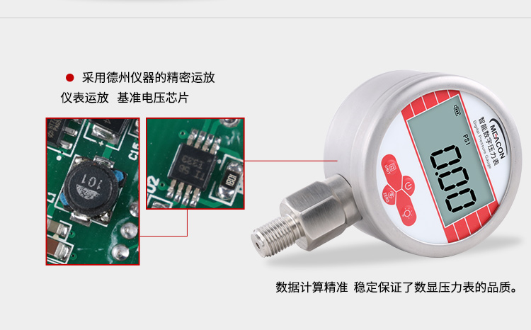 MIK-Y190数显压力表,内置高精度压力传感器,能够准确实时显示压力,并且具有抗震动、显示精度高、稳定性高、可清零等特点。该款智能压力表采用LCD显示屏,具有背光、单位切换等多种功能,操作简单,安装简捷。由于采用低功耗的处理器芯片,续航时间长,具有自动待机与一键清零功能,使用方便。该款智能数显压力表可以测量水、油、空气等对不锈钢无腐蚀的介质,适合压力容器、自动化设备、实验室设备配套的使用。